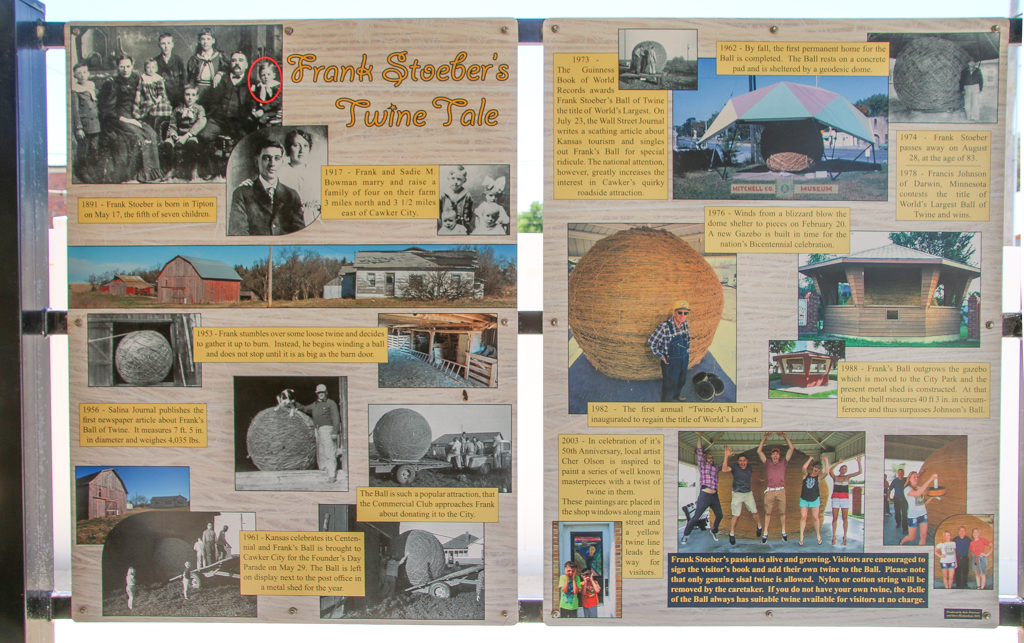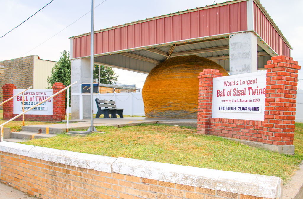 Mention Kansas and one of the first things anyone will talk about is the Ball of Twine. People may give a chuckle when the Ball of Twine is mentioned, but curiosity gets them best of them and they to go see it. The Ball of Twine is also part of the most highly debated topic in the arena of the world's largest things. Which town does have the world's largest ball of twine? Cawker City Kansas wins the debate if you're looking for the World's Largest Ball of Sisal Twine still growing! Frank Stoeber started winding twine December 24, 1953 on his farm and soon neighbor farmers started bringing their twine to him. In 1961 his symbol of thrift had grown to such grand proportions that it was moved to town under a shelter so all could see it! Frank has since passed away but the community still adds to the Ball of Twine at the annual Twine-athon held the third weekend of every August. When visitors stop at the Ball of Twine and are noticed by twine ball caretaker, Linda Clover, she zooms over in her car and asks them if they, too, want to add to the Ball of Twine! Smiles broaden as she opens her trunk and pulls out some twine, carefully records the amount, and then helps the delighted visitor become part of history! As of September 2009 the Ball of Twine weighed 19,198 pounds and is 7,974,454 feet long--1,510.31 miles worth! Darwin, Minnesota is known as the World's Largest Ball of Sisal Twine wound by one man. This finished product weighs in at 17,400 pounds and is approximately 40 feet in circumference. There is a larger plastic ball of twine but it weighs much less. This debate is for the heavyweights!